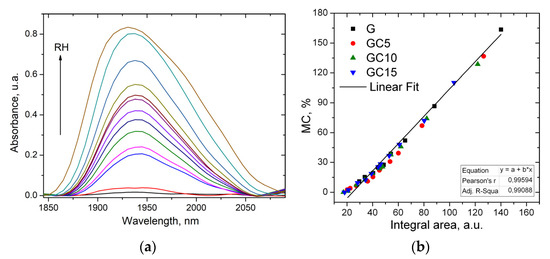 To highlight the presence of water molecules in the composite films, NIR spectroscopy was used. The band from about 1940 nm is highly sensitive to the presence of water molecules being assigned to their stretching vibration. Figure 6a shows the integral area of this band in the case of GC15 composite film. The integral area increases with the increase of the MC in the films and the moisture content shows a linear dependence (R2: 0.99) when it is plotted as a function of the integral area of this band (Figure 6b).