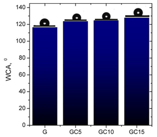 G film exhibited the lowest value for water contact angle (116°), which indicates it has more hydrophilic behavior compared to composite films. This is due to the fact that the polar amino acids in the gelatin backbone are more susceptible to moisture absorption [11]. Adding CNCs to gelatin increased the water contact angle value to 123° for GC5, to 124° for GC10 and to 127° for GC15 film. This could be due to formation of hydrogen bonds between gelatin polar groups and CNC hydroxyl groups [12], but also to a higher roughness due to CNCs dispersion within the gelatin matrix. Ahammed et al. [32] observed that WCA was 104.8° for gelatin film and the surface roughness induced by addition of zein in the films can significantly affect WCA values, decreasing it up to 50°. Moreover, Pereira et al. [37] found that the gelatin-based films exhibited values of WCA between 90° and 98°, with these values being influenced by the incorporation of ZnO, indicating that the increase of nanoparticle concentration enhanced the WCA of the films. Corrêa de Souza Coelho et al. [51] observed that adding CNCs into the starch matrix led to an increase of the WCA compared to starch control film, but this improvement was dependent on the content of the CNCs in the matrix. Therefore, for the incorporation of an amount up to 10% of CNCs the WCA increased, with this “behaviour corresponding to highly crystalline, hydrophobic characteristics of CNCs”. When the authors used a higher concentration of CNCs (15%), they observed similar values of the WCA with the control film. They mentioned that this can be due to a “possible aggregation caused by the higher CNC concentration in the matrix”. However, this behavior was not observed in our case, where the addition of 15% CNCs into the polymeric matrix induced a further increase in the contact angle.