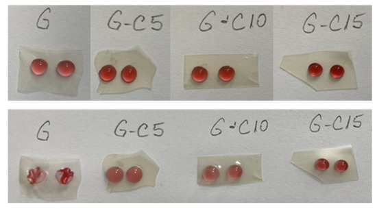 With the exception of gelatin film where the droplets were quickly absorbed, it was observed that the droplets remained on the surface of the nanocomposite films, presenting a low degree of absorption, and the dry-in time was of 30–35 min. This is due to the increasing resistance of the films reinforced with CNC compared to the neat gelatin film, where water droplets caused its dissolution. Another study [22] observed that the droplets remained on the surface of the carrageenan CNC films, presenting a low degree of absorption and having a dry-in time of about 40–45 min.