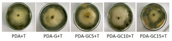 For the compatibility test, the poisoned food technique was used to evaluate the influence of the polymeric matrix on the development on T. harzianum spores [51]. For that, in the PDA medium (agar, 15 g/L, NaCl, 5 g/L, tryptone, 10 g/L, yeast extract, 5 g/L) 1.5 wt% solutions of G, GC5, GC10 and GC15 with a concentration of 1% were added. On the obtained medium, T. harzianum KUEN 1585 was placed, and the Petri dishes were kept at 25 °C for 7 days. Colony morphology and mycelial growth were observed daily. A Petri dish with PDA only with T. harzianum KUEN 1585 was used as a control. The influence of polymeric solutions on the development of T. harzianum KUEN 1585 was observed after 7 days. Twice the experiments were carried out in a randomized fashion in three replications for each treatment.