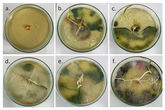 Viability test: corn seed on the first day (a), seeds on the 7th day (b–f): seeds treated with T. harzianum KUEN 1585 (b), G + T (c) GC5 + T (d), GC10 + T (e), GC15 + T (f).