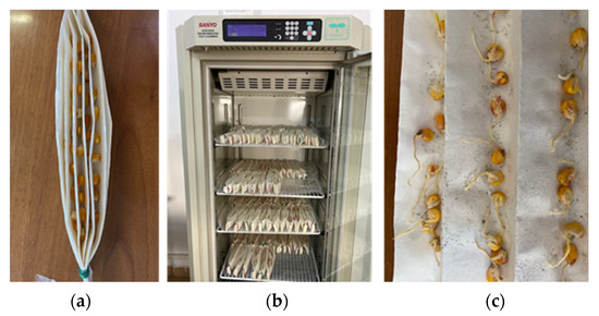 The seeds were placed at 25 °C, 85% RH, in the dark for 7 days in paper towels for assessing the germination and seed quality parameters. Daily germination counts were recorded until no further germination occurred [62]. The number of normal seedlings and the length of the roots were counted after the test period and the germination (%) was calculated using the formula: