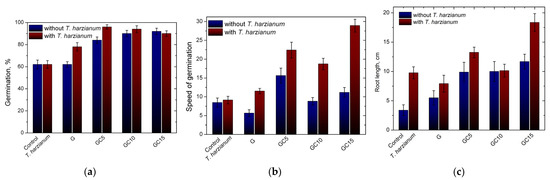 The germination percentage of the seeds coated only with polymeric composite compared with seeds coated with T. harzianum KUEN 1585 are presented in Figure 14. It can be seen that the germination percentage is improved when seeds are coated with the polymeric material. The lowest G% value is observed for control group (62%) and seeds treated only with G and T. harzianum KUEN 1585, respectively. Increasing the CNC content in the seed coating agent led to an increase in the G% up to 92% for GC10 and 90% for GC15. This can be attributed to the more compact structure of the coating that remains closer to the seed for a longer time, enhancing the germinability [20]. Furthermore, when the biofertilizer was added in the seed-coating material, the germination percentage improved, especially for gelatin and GC5 (Figure 14a). This fact can be assigned to the faster decomposition of gelatin, which enhanced the development of the biofertilizer, thus improving the G%. Moreover, in the case of seeds treated just with T. harzianum KUEN 1585, the G% was not improved, being an indicator that the development of the biofertilizer is influenced by the presence of the coating, which maintains the spores close to the seeds and may be acting as a nutrient for Trichoderma spp. after decomposition [20]. At the same time, the speed of germination was not significantly influenced by the polymeric coating, but when T. harzianum KUEN 1585 was added in the coating material the speed of germination improved, from 8.7 in the case of the control group up to almost 30 in the case of the GC15 + T group. This is an indicator that the germination process is accelerated due to the action of the biofertilizer [13]. Again, in this case, the values for speed of germination were higher when T. harzianum KUEN 1585 was incorporated in the coating material compared with the seeds treated just with the spores, indicating that the efficacy of the biofertilizer is improved when it is incorporated into the polymeric matrix [57].