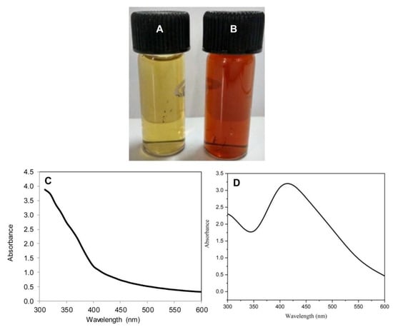 Color change showing biosynthesis of PGL-AgNPs. (A) PGL leaves extract, (B) PGL-AgNPs resuspended in double-distilled water, (C) UV-vis spectrum of PGL leaves extract and (D) UV-vis spectrum of synthesized PGL-AgNPs with a peak around 420 nm.