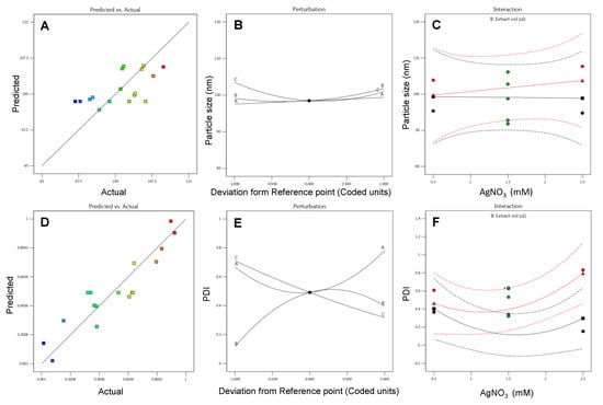 Model diagnostic plots predicted v/s actual, perturbation and interaction plots for response variables (A–C) particle size and (D–F) PDI for P. granatum leaves extract mediated silver nanoparticles.