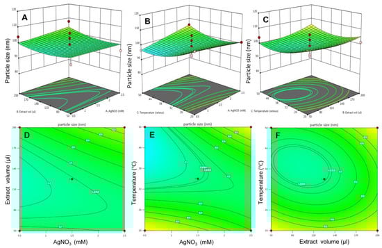 Box and Wilson, in 1951, introduced response surface methodology (RSM) as a tool that combines mathematical and statistical approaches to optimize variables or factors for a given model system [26]. Here the existence of all the possible interactions amongst the three independent variables with their impact on responses was evaluated by 2D contour plots and 3D response surface plots. In Figure 3A,D, the effect of AgNO3 concentration and extract to AgNO3 ratio on response particle size was determined. The 3D response surface plot depicts that there was no such association of both the variables on particle size, yet particle size slightly increases at higher levels. The 2D contour plot also predicts the maximum number of particles formation at higher levels. The link between AgNO3 concentration and temperature is shown in Figure 3B,E. It has been seen that when elevating the AgNO3 concentrations at low levels of temperature, a declining pattern of particle size was observed. Whereas at higher temperatures, an increase in AgNO3 concentration showed an inclination pattern of particle size. The 2D contour plot also revealed the same relationship. The relationship between extract to AgNO3 and temperature was depicted in Figure 3C,F. Increasing the volume of the extract at a lower range of temperatures showed a drop in the pattern of particle size, whereas when increasing the extract volume at a higher level of temperatures, an increment in particle size was observed.