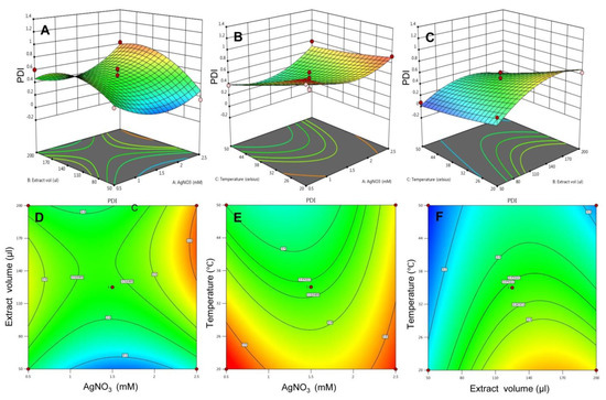The 3D surface plot and the 2D contour plots for response—PDI. (A) 3D surface plot for effect of extract volume and AgNO3 on PDI and (D) is 2D plot for the same, (B) 3D surface plot for effect of temperature and AgNO3 on PDI and (E) is 2D plot for the same, (C) 3D surface plot for effect of temperature and AgNO3 on PDI and (F) is 2D plot for the same.