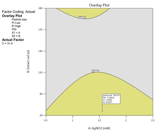 The optimization of parameters for PGL-AgNPs biosynthesis was attained by numerical optimization through BBD. Once the experimental validation of 17 reactions was done, the obtained data for responses—particle size and PDI—were subjected to numerical optimization. Herein, the data were adjusted in the desired range, and an overlay plot was generated to depict the desired conditions for biosynthesis purposes. In Figure 5, the yellow region predicted the optimized area for the biosynthesis of silver nanoparticles. The plot depicts that desired range of PDI, i.e., below 0.3, obtained at a higher concentration of AgNO3 while keeping extract volume at the lowest range. The flagged point describes the optimized parameters for the same. As a result, the uniformly distributed nanoparticles can be biosynthesized when the concentration of AgNO3 is 1.5 mM, with extract volume of 55.55 µL taken and the reaction carried out at 31.4 °C continued for 15 min.