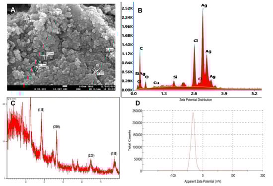 Characterization of PGL-AgNPs synthesized at optimal conditions i.e., 25 °C when the concentration of AgNO3 is 1.0 mM, at extract to AgNO3 ratio of 1:10 and the reaction continued for 15 min. (A) An SEM image of PGL-AgNPs with an average size of ~37.5 nm, (B) an EDX pattern of PGL-AgNPs, (C) an XRD spectrum of AgNPs, (D) a Zeta analysis showing zeta potential is 34 mV.