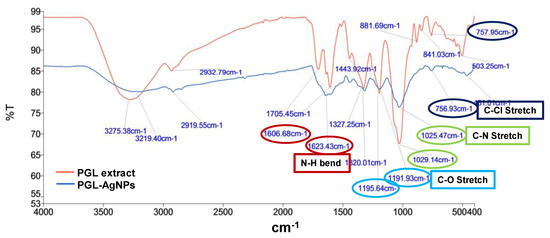 The FTIR spectrum of P. granatum leaves extract and PGL-AgNPs was recorded within the wavenumber range of 4000–400 cm−1 region. The AgNPs showed major peaks at 1623 cm−1 (N-H bend), 1191 cm−1 (C-O stretch), 1025.5 cm−1 (C-N stretching) and 756 cm−1 (C-Cl stretching), suggesting the relationship of primary amines, aliphatic amines and alkyl halides of the constituting biomolecules present in the extract (Figure 7). N-H stretching comparable to primary and secondary amines was found in both extract and AgNPs, which implies that they might be liable for capping and stabilization of PGL-AgNPs. In the PGL extract, the band at 3275 cm−1 was attributed to the polyphenols, while in the PGL-AgNPs, the vibration band moved toward the shorter frequency of 3219 cm−1, suggesting the implication of functional groups associated with polyphenols as reducing agents during biosynthesis of AgNPs [31]. The band at 2933 cm−1 due to O-H stretching vibration, band at 1705 cm−1 due to C=O stretching vibration, the band at 1327 cm−1 due to C-O stretching vibration and the band at 1444 cm−1 due to O-H bending vibration visible in the PGL extract were assigned to the phenolic acids, and also moved to the shorter frequency in the PGL-AgNPs, substantiating the implication of phenolic acids as reducing and capping agents [32]. The band at 1029 cm−1 could be attributed to C-OH stretching vibration that arises due to the presence of polysaccharides.
