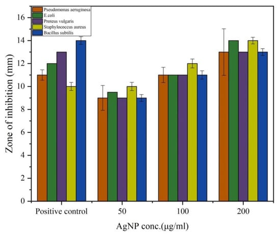 In the present study, the antibacterial efficacy of PGL-AgNPs was assessed against both Gram-negative and Gram-positive bacteria using disc diffusion assay where ampicillin was employed as a positive control because it is effective against a broad spectrum of Gram-positive and Gram-negative bacteria as it targets the synthesis of the bacterial cell wall [41]. An increment in the zone of inhibition was found when the concentrations of PGL-AgNPs were raised from 50 μg/mL to 200 μg/mL (Figure 8). The outcomes indicate that the biosynthesized PGL-AgNPs were quite effective against both the studied Gram-positive and Gram-negative bacteria (Figure S1, see Supplementary Materials). Sondi et al. also reported inhibition of E. coli with a hike in AgNPs concentration and the initial number of cells used for the tests [35]. AgNPs of 50–60 μg/cm3 concentration exhibited 100% inhibition of growth, and the cells were impaired as a result of the development of cracks in the bacterial cell wall [35]. Potent bacterial growth inhibition of P. aeruginosa and E. coli was observed at concentrations as low as 25 and 50 μL using P. granatum leaves extract biosynthesized AgNPs [20].