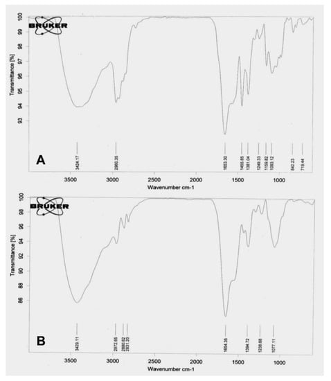 FTIR spectra of (A) untreated and (B) PGL-AgNPs treated bacterial cells.