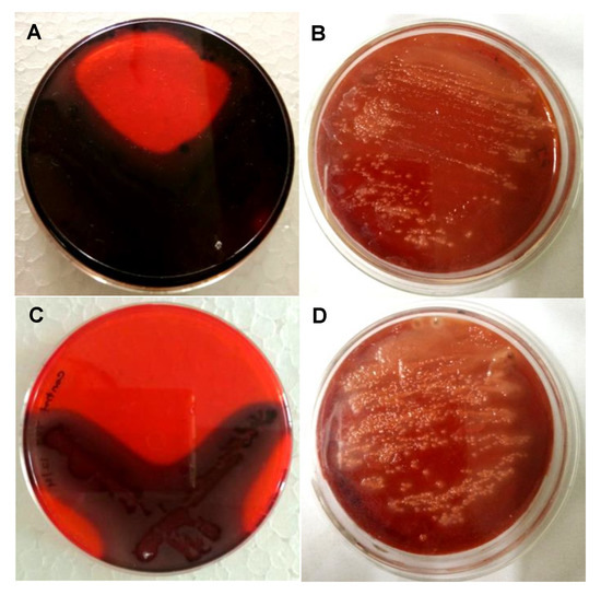 The Congo red assay was performed to detect the biofilm inhibition efficacy of biosynthesized PGL-AgNPs. Biofilms facilitate the bacteria’s survival in hostile conditions within or outside the host and are considered to be one of the reasons for chronic or persistent infections [51]. The Congo red dye labels the exopolysaccharides (EPS) secreted by the bacteria that are further utilized for the formation of biofilms [52]. The CRA method is fast, reproducible and the outcomes can be interpreted on the basis of the color of the colony obtained. The appearance of black-colored colonies exhibits biofilm production, whereas the appearance of red colonies displays biofilm inhibition. Herein, two different strains, i.e., P. aeruginosa and S. aureus, were exposed to biosynthesized PGL-AgNPs, and their biofilm formation capability was assessed. As evident from (Figure 11B,D), the red color appeared due to inhibition of biofilm formation due to exposure of both strains to PGL-AgNPs. In contrast, when the two strains were not treated with PGL-AgNPs, they formed biofilm, as evident from the appearance of black color in the region of streaking (Figure 11A,C). In one of the studies, Kalishwaralal et al. claimed inhibition of biofilm formation in P. aeruginosa exposed to AgNPs synthesized using B. licheniformis biomass, where 50 nM of AgNPs remarkably inhibited biofilm [53]. In another study, Arya et al. claimed inhibition of biofilm formation using biosynthesized AgNPs using Prosopis juliflora leaf extract in B. subtilis and P. aeruginosa [14].