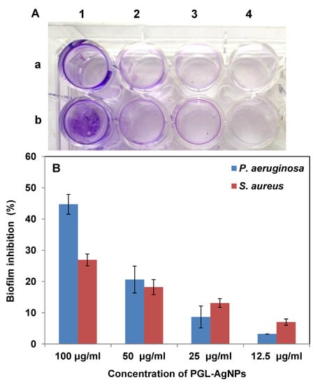 Assessment of the antibiofilm activity of PGL-AgNPs by crystal violet assay. (A) rows a and b represent P. aeruginosa and S. aureus, respectively, with increasing PGL-AgNPs concentrations (12.5 to 100 µg/mL) marked as 1–4, (B) Quantitative representation of antibiofilm activity. The biofilm inhibition was dose-dependent.