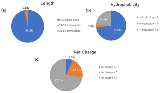 Percentage of the peptides’ properties regarding their (a) length, (b) hydrophobicity, and (c) net charge from 316 putative ACPs.