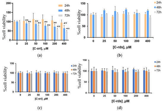 Inhibition of HT-29 cell viability treated by (a) C-ori and (b) C-rds. The cell viability of human dermal fibroblast cells treated by (c) C-ori and (d) C-rds. Cell viability was assessed by an MTT assay after a 24 h, 48 h, and 72 h incubation with drugs. The results shown are mean ± SD; n = 4 trials. (** p < 0.01).