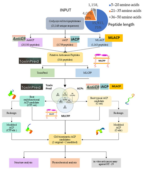 As can be seen in the pipeline illustrated in Figure 7, we proposed the bioinformatic virtual screening workflow with an in vitro validation start from stating the inputs of 21,148 putative unique peptide sequences until we selected the top predicted scores of unique ACP groups and multifunctional ACPs (with cytotoxicity and cell-penetrating abilities). Redesigns were also performed to improve the predicted scores, and the biomimetic peptides were experimentally tested with both the non-metastasis colorectal cancer cell line HT-29 and the human dermal fibroblast cell line to ensure the specific effects on cancer cell lines.