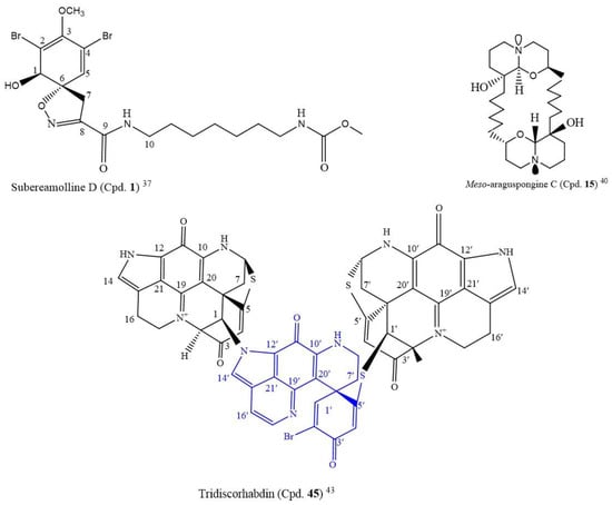 Following the LC-MS/MS molecular networking-based metabolomics and cytotoxic activity-guided study, two new discorhabdin-type alkaloids, tridiscorhabdin (Cpd. 45) and didiscorhabdin (Cpd. 46), were isolated from Latrunculia biformis, a sponge from the Weddell Sea (Antarctica). As novel compounds, a unique C-N bridge (C-1/N-13) between discorhabdin monomers was present in them, with Cpd. 45 being the first trimeric discorhabdin molecule isolated from the natural environment. Additionally, this compound was cytotoxic to human colon cancer cell line HCT 116 at 0.31 µM IC50. It equally inhibited the non-cancerous human keratinocyte cell line HaCaT with a similar IC50 value (IC50 = 0.92 μM), thus, suggesting its general toxicity and low selectivity for cancer cells; the structure is in Figure 2 [43].