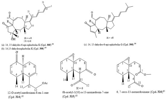 Three novel nardosinane-type sesquiterpenes, 12-O-acetyl-nardosinan-6-en-1-one (Cpd. 314), 6b-acetyl-1(10)-a-13-nornardosin-7-one (Cpd. 315), and 6, 7-seco-13-nornardosinane derivatives (Cpd. 316), together with six known compounds (Cpds. 317–322), were isolated from Rhytisma fulvum fulvum, an alcyonacean soft coral. Due to the C-6 epimerization of Cpd. 317, Cpd. 315 was considered an artifact. All the compounds were cytotoxic to NCI-H1299, HepG2, and MCF-7 with IC50 ranges of 0.0352–0.0974, 0.0717–0.3745, and 0.0341–0.1325 µM, respectively (Table S2). The structures of the novel compounds are shown in Figure 3 [65].