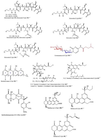 The isolation of sekgranaticin (Cpd. 420), granaticins A (Cpd. 421) and B (Cpd. 422), and methyl granaticinate (Cpd. 423), was carried out with the culture broth of Streptomyces sp. 166#. Sekgranaticin (Cpd. 420) is a novel hybrid polyketide with a complex 6/6/6/6/6/6/6 7-ring system [77]. The compounds inhibited the growth of MCF-7, A549, P6C, and HCT-116 cancer cell lines with the IC50 values of 0.02−6.77 μM (Table S3) [77].