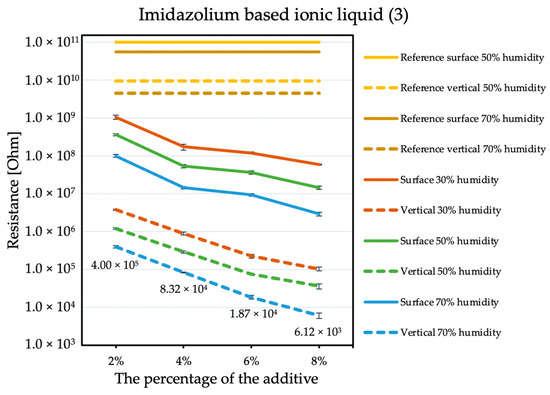 By comparing the results obtained for the tetraalkylammonium salt additive (Figure 1) with the results obtained for additives number two (Figure 2) and three (Figure 3), the structure of this compound should be explained. In the case of additive no. 1, a long alkyl chain is attached to the tetraalkylammonium cation, and it is known that the increase in alkyl chain affects increasing viscosity. This is the result of an increase in van der Waals forces and a decrease in the mobility of the salt ions, resulting in low ionic conductivity; thus, conductivity decreases with increasing alkyl chain length [31,32]. At this point, it is worth mentioning the viscosity values of the antistatic additives used, which their manufacturers provide in the technical data sheets of their products: viscosity of the first additive is above 3000 mPa·s, while the KPF6 solution and the imidazolium-based ionic liquid used in the present study have viscosities of about 15 mPa·s (25 °C). In the case of the second additive, it can be observed that adding it in the amount of 2% causes a decrease in electrical resistance, but increasing its concentration in the first steps does not cause further significant drops. Only when 8% is added, another greater reduction occurs. Nevertheless, even with the addition of 2% of additive no. 2, the electrical resistance results are better than with the addition of 8% of additive no. 1. The no. 3 additive, even at small amounts, significantly improves the antistatic properties of the coating, and each subsequent increase in its concentration in the material increases this ability. Comparing the third additive with the second, it appears that even 2% of additive no. 3 provides an electrical resistance similar or slightly better than that obtained with 8% of additive no. 2. The effectiveness of all the additives used is strongly dependent on the relative air humidity. The highest values of electrical resistance are obtained in a dry environment. However, with increasing humidity, the resistance begins to decrease.