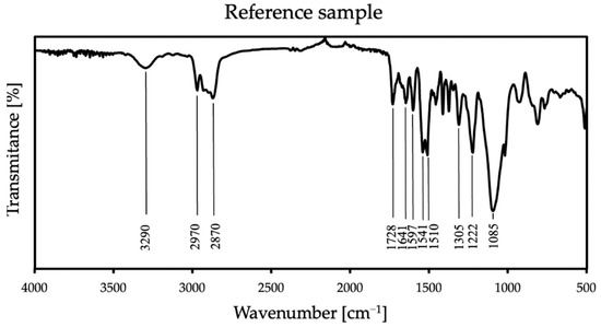 FT-IR analysis is used to identify organic, inorganic, and polymeric materials. The changes in the pattern of the characteristic absorption bands indicate a change in the composition of the material. FT-IR can be useful for detecting contaminants in a material, finding additives, and identifying degradation and oxidation [33]. In this work, the verification of FT-IR spectra was aimed at checking whether the modification of the material with an antistatic additive would affect the course of the reaction, the formation of new, different bands, or the disappearance of the expected ones. This analysis also helped to exclude product defects that may occur due to improper mixing, which may be caused by air entrainment or differences that are too large in viscosities. The FT-IR results from thirteen samples were obtained and identified based on literature data (Williams and Flemming [34]; Silverstein, Webster, and Kiemle [35]). Figure 4 shows the complete spectral analysis of the reference sample.