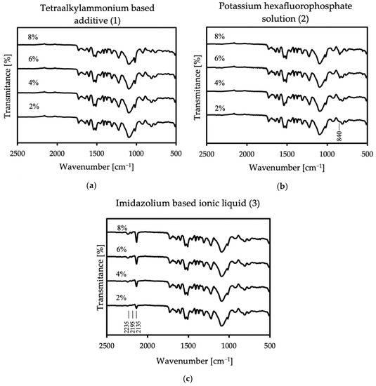 In the case of the first additive, no additional bands appear in the spectrum. However, in the case of additives two and three, additional lines are more intense with increasing antistatic agent. The spectra of the sample containing potassium hexafluorophosphate show a peak at 840 cm−1, which stands for PF6− anion [39,40]. A very strong peak appears in the sample with imidazolium-based ionic liquid at 2135 cm−1, assigned to the asymmetric CN stretch. The next two bands appear at the lengths of 2195 and 2235 cm−1, and they are definitely weaker than the previous ones in this area. The first one corresponds to the symmetric CN stretch, while the second one can be assigned to a combination band of the symmetric and asymmetric CN stretching modes. Additive no.3 contains the dicyanamide anion, and the new bands that appeared in the spectrum correspond to its presence [41,42]. The FT-IR analysis shows that antistatic additives may affect the chemical composition of the coating, which may result in a change in some of its properties. The lack of disappearance of the reference spectrum bands in the modified materials proves that the antistatic additives did not adversely affect the course of the reaction itself.