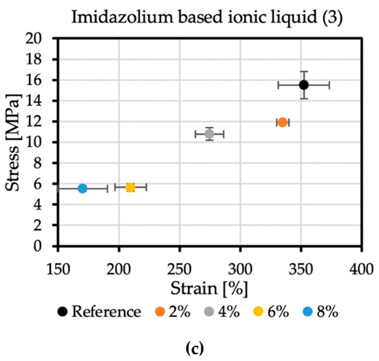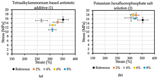 The reference sample achieved the tensile stress value of 15.5 MPa, while the elongation at break was 352.36%. In the case of additive no. 1 (Figure 6a), increasing its concentration reduces the strength and elongation at break. The result for the 4% concentration, which differs from the trend, may be caused by too early an attempt to remove the sample from the polypropylene plate after spraying. The addition of 8% of antistatic additive resulted in a material that achieved tensile stress of 10.97 MPa and an elongation at break of 309.62%. Additive no. 2 (Figure 6b) is a KPF6 solution, and all the obtained results are within a certain range. The strength at break is greater than the reference sample, but the elongation at break is lowered. The addition of 6% of this antistatic additive resulted in a material that achieved tensile stress of 17.95 MPa and an elongation at break of 313.78%. The additive no. 3 (Figure 6c) has a significant impact on the mechanical properties of the sprayed coatings. The addition of 2% of this antistatic additive results in a reduction in tensile stress to 11.9 MPa, resulting in elongation at a break of 335.11%. At the highest concentration of the antistatic additive used, the coating withstands tensile stresses of only 5.54 MPa, while the elongation at break is then 170.38%, which is not even half of the value obtained for the reference sample. The reason for such a significant deterioration of mechanical properties may be a change in the chemical composition of the coating and the incompatibility of the additive with the polymer matrix. The materials made with this antistatic agent showed the weakest tensile tests results, but none of the formulas had been optimized yet.
