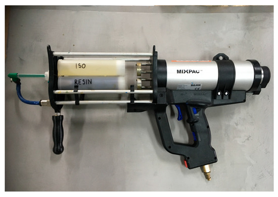 The coatings were sprayed with the component volume ratios of 1:1. Adding an antistatic agent requires adjusting the recipe by equalizing the number of functional groups in component B with component A, so that they are the same. Each sample was prepared in a volume of 300 mL by adding all components of Part B to a 500 mL beaker and mixing them with a spiral stirrer for 3 min. Component B, prepared in this manner, and component A were poured into an AF 400-01-10-01 cartridge (200 mL per side) and left for a few minutes for deaeration. The next step of sample preparation was spraying by using a Sulzer mixpac pneumatic dispenser equipped with MFQ 07-18C-06 static mixers (Figure 9). The samples were sprayed onto smooth polypropylene plates, removed after half an hour, left in a room temperature for 12 h, and placed in a climatic chamber at 70 °C for 48 h. As described, the above samples were prepared with concentrations of 2, 4, 6, and 8% for the finished coating for each of the three antistatic additives, and a reference sample. Each sample was approximately 1.5 mm thick and had an area of 0.25 square meters.