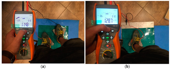Measurements were performed with a Sonel MIC-10 device and Sonel PRS-1 probes in accordance with the PN-EN 1081:2001 standard [46]. Before the measurements, the samples were prepared according to the requirements of the standard. Each sample was wiped with a cleaning fluid (ethanol), and then a graphite suspension was applied to the underside of the sample. The materials prepared in this manner were placed in a climatic chamber at a temperature of 40 °C for 96 h. After this step, the conditioning of the samples for the given test started, and it was performed in such a manner that the result reflected the influence of humidity on the electrical resistance values. In order to obtain the result, the sample stayed in the climatic chamber for the next 48 h at a temperature of 23 °C and relative humidity corresponding to the planned test (30%, 50% and 70%). The point-to-point/surface (Figure 10a) and vertical (Figure 10b) resistances were measured. The surface resistance is measured between two tripod electrodes placed at a constant distance of 100 mm on the laid test sample. The vertical resistance is measured between the tripod electrode placed on the surface of the test sample and a metal plate placed under the sample, which works as the base electrode. For resistances lower or equal to 106 Ω, a constant voltage of 100 volts was used, while for resistances greater than 106 Ω, a voltage of 500 volts was used. The resistance was read at 10 s after the voltage was switched on. For areas smaller than 10m2, the standard requires at least three measurements. In this work, five measurements of each resistance were made, the obtained results were averaged, and standard deviation was calculated.