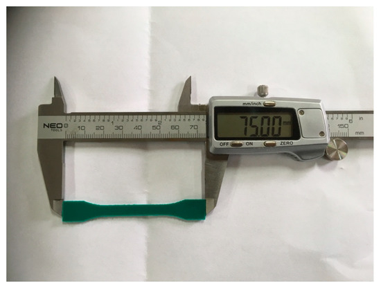 Due to the high flexibility of polyurea, 1BA-shaped specimens (Figure 12) were used, which were cut with a milling machine. Each series consisted of five specimens. All tests run up to the failure point with two rates. The first rate was 2 mm/min until the specimen reached 2% elongation. The rate then changed to 100 mm/min. Elongation was measured from the crosshead displacement. Average values and standard deviation were calculated from the obtained tensile strength and elongation at break results.