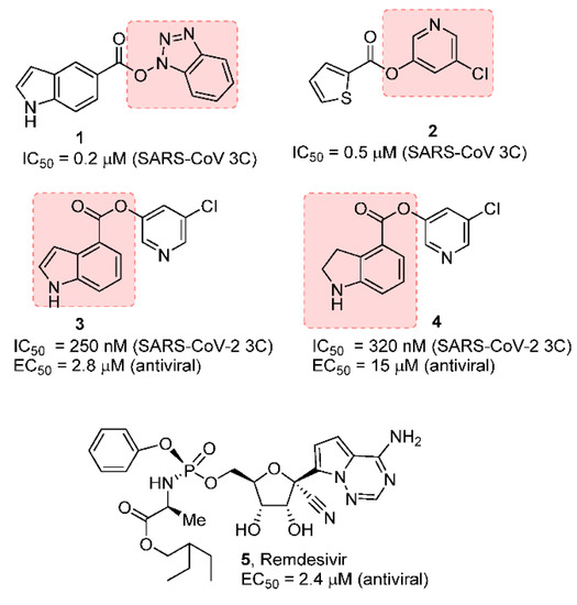 - Wu, C.Y.; King, K.Y.; Kuo, C.J.; Fang, J.M.; Wu, Y.T.; Ho, M.Y.; Liao, C.L.; Shie, J.J.; Liang, P.H.; Wong, C.H. Stable benzotriazole esters as mechanism-based inactivators of the severe acute respiratory syndrome 3CL protease. Chem. Biol. 2006, 13, 261–268. [Google Scholar] [CrossRef] [Green Version]