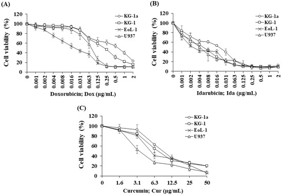 Cytotoxicity of (A) doxorubicin, (B) idarubicin, and (C) curcumin on KG-1a, KG-1, EoL-1, and U937 cells. The data are shown as mean ± SD from 3-time independent experiments.