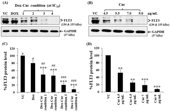 FLT3 protein expression of KG-1a cells after treatment with Dox and combined treatment of Dox–Cur at concentration value of IC20 for 48 h. Protein bands (A) and percentage (C) of FLT3 protein expression level of KG-1a cells treated with DMSO (VC), Dox at concentration of 60 ng/mL, Dox–Cur condition 1 (15 ng/mL Dox + 4.5 µg/mL Cur), Dox–Cur condition 2 (16 ng/mL Dox + 5.5 µg/mL Cur), Dox–Cur condition 3 (12 ng/mL Dox + 7 µg/mL Cur), and Dox–Cur condition 4 (8 ng/mL Dox + 9 µg/mL Cur) for 48 h. Whole protein lysates (80 μg/lane) were loaded onto SDS-PAGE. Protein bands (B) and percentage (D) of FLT3 protein expression level of KG-1a cells treated with DMSO (VC), Cur (4.5 µg/mL), Cur (5.5 µg/mL), Cur (7 µg/mL), and Cur (9 µg/mL) for 48 h. The data are shown as mean ± SD from 3 independent experiments. The significance of mean differences was assessed using one-way ANOVA. * p < 0.05, ** p < 0.01, and *** p < 0.001 compared with VC. # p < 0.05, ## p < 0.01, and ### p < 0.001 compared with single-Dox treatment.