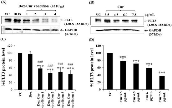 In this study, KG-1a, KG-1, and EoL-1 cells were treated with Dox. Co-treatment was conditions at the IC20 value, and FLT3 protein expression levels were detected by Western blot. Dox and Dox–Cur co-treatment could decrease FLT-3 protein expression. In KG-1a cells, the FLT3 protein levels of Dox and Dox–Cur treatment conditions 1, 2, 3, and 4 were decreased by 20.4 ± 8.8%, 51.6 ± 14.5%, 54.6 ± 12.2%, 80.2 ± 5.7%, and 92.2 ± 8.2%, respectively (Figure 2A,C). For KG-1 cells, FLT3 proteins were gradually decreased by 2.7 ± 6.5%, 42.3 ± 2.9%, 55.0 ± 5.4%, 52.0 ± 7.3%, and 57.9 ± 11.5% in respond to Dox and Dox–Cur conditions 1, 2, 3, and 4, respectively (Figure 3A,C). Similarly, FLT3 protein expression in EoL-1 cells was reduced to 2.7 ± 5.6%, 10.7 ± 4.2%, 29.9 ± 6.8%, 35.2 ± 6.4%, and 43.7 ± 15.7% in response to Dox and Dox–Cur conditions 1, 2, 3, and 4, respectively, compared with the control group (100% expression level; Figure 4A,C). Additionally, the ability of each concentration of Cur in the combination treatment to suppress FLT3 protein expression was evaluated. All concentrations of Cur treatments were also able to decrease the protein expression levels compared with the control group in a dose-dependent manner (Figure 2B,D, Figure 3B,D and Figure 4B,D).
