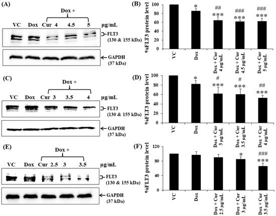 FLT3 protein expression of KG-1a, KG-1, and EoL-1 cells following treatment with Dox and combination of fixed concentration of Dox and various non-toxic concentrations of Cur for 48 h. Protein bands (A) and percentage (B) of KG-1a cells treated with DMSO (VC), Dox (15 ng/mL), Dox + Cur (4 µg/mL), Dox + Cur (4.5 µg/mL), and Dox + Cur (5 µg/mL), for 48 h. Protein band (C) and percentage (D) of KG-1 cells treated with DMSO (VC), Dox (22 ng/mL), Dox + Cur (3 µg/mL), Dox + Cur (3.5 µg/mL), and Dox + Cur (4 µg/mL) for 48 h. Protein band (E) and percentage (F) of EoL-1 cells were treated with DMSO (VC), Dox (2.8 ng/mL), Dox + Cur (2.5 µg/mL), Dox + Cur (3 µg/mL), and Dox + Cur (3.5 µg/mL) for 48 h. Whole protein lysates (80 μg/lane) were loaded onto SDS-PAGE. The data are shown as mean ± SD from 3 independent experiments. The significance of mean differences was assessed using one-way ANOVA. * p < 0.05 and *** p < 0.001 compared with VC. # p < 0.05, ## p < 0.01, and ### p < 0.001 compared with single-Dox treatment.