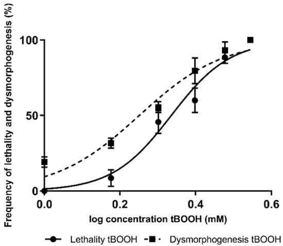 Concentration–response curves for lethality and dysmorphogenesis produced using tert-butyl hydroperoxide (tBOOH).