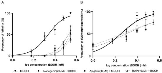 Concentration–response curves produced by tBOOH, in combination with different flavonoid compounds for (A) lethality and (B) dysmorphogenesis.