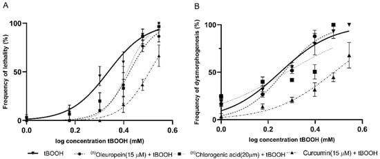 Oleuropein (15 µM), chlorogenic acid (20 µM), and curcumin (15 µM) were also analyzed. These polyphenols resulted in a significant drift in the concentration–response curves for lethality. Only curcumin exhibited a protective effect against dysmorphogenesis (Figure 3).