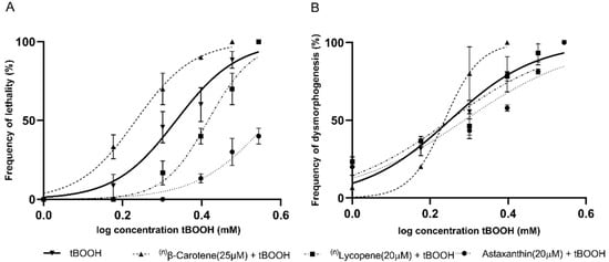 Concentration–response curves produced using tBOOH in combination with different carotenoid compounds for (A) lethality, and (B) dysmorphogenesis. (n)Note: The absence of points on the graph at higher concentrations is because they already produced a 100% embryo lethality in all replicates.