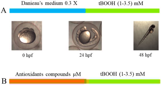 For the preparation of the tBOOH curve, the methodology of Boix, 2020, was followed. This methodology is based on obtaining a concentration–lethality response (LC50) curve and dysmorphogenesis (EC50) by exposing the ZF embryos to an oxidative stress inducer, tert-butylhydroperoxide (tBOOH). Once zebrafish embryos are obtained, they are kept in 0.3X Danieau’s medium from 0 to 24 hpf. From 24 to 48 hpf, the embryos are exposed to tBOOH solutions at different concentrations, of 1, 1.5, 2, 2.5, 3, and 3.5 mM. Embryos from 3 different clutches of zebrafish in triplicate were used (Figure 5A).