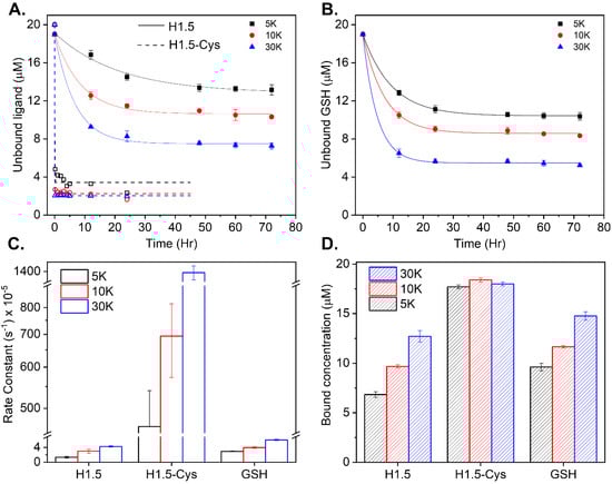Adsorption of small peptides onto PEGylated AuNPs. (A) Free H1.5 (closed symbols, solid lines) and H1.5-Cys (open symbols, dashed lines) concentrations vs. time in the presence of 5K, 10K, and 30K PEGylated AuNPs during the 0–72 h incubation period. The kinetic study for H1.5-Cys was performed for only 24 hrs due to its fast adsorption kinetics. (B) GSH adsorption to PEGylated AuNPs during the same time duration. The curves in (A,B) are a pseudo-first-order kinetics fit, and the error bars are the standard error of the mean. (C) Adsorption rate constants for H1.5 and GSH for different PEGylated AuNPs obtained from the pseudo-first-order kinetic fit. (D) Bound concentration at the final time point of H1.5 and GSH for different PEGylated AuNPs after 72-hour incubation. The apparent adsorption rates and bound concentrations of all ligands used in this work are summarized in Table S1 (Supporting Information). Error bars in panels (C,D) represent uncertainties calculated from a weighted least squares minimization of the reduced chi-squared performed in OriginPro 2021b (Northampton, MA, USA).