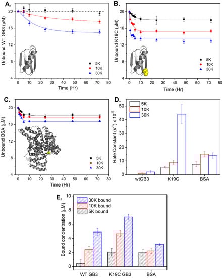 In contrast, when one cysteine residue is introduced into GB3 (K19C GB3), both adsorption amount and adsorption rate increase significantly for all types of PEGylated AuNPs (Figure 3). For example, while the adsorption of WT GB3 on 5K-PEG-AuNPs was barely within the limits of detection for our experiment over 72 h, 2.1 ± 0.5 µM K19C GB3 is able to penetrate and bind onto these nanoparticles after only 10 h incubation. This difference becomes smaller as the PEG size is increased. While greater adsorption is always observed for K19C GB3, 10K-PEG-AuNPs allow nearly twice as much binding of K19C vs. WT GB3, but 30K-PEG-AuNPs allow only 1.4 times as much binding. In addition to increasing the final amount of adsorbed protein, introducing a cysteine residue also increases the rate at which adsorption occurs. We could not determine a pseudo-first order rate constant for WT GB3 adsorption to 5K-PEG-AuNPs, but rate constants could be reliably fit for the larger PEG sizes. Indeed, the calculated adsorption rate constants of K19C GB3 for both 10K-PEG-AuNP and 30K-PEG-AuNP are ~9 and ~23 times larger, respectively, than those measured for WT GB3 (Figure 3D).