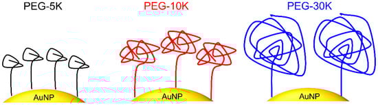 In practice, there are numerous approaches to PEGylation, and size, terminal modification, and charge can all be modified [26,27,28]. PEGylation is conducted using several unique techniques including detritylating PEG derivatives, covalent attachment, entrapment, or AuNP surface adsorption of PEG chains. The effect of the PEGylation depends on the PEG molecular weight, polymer chain architecture, and PEG surface density on the NP surface [29,30]. For example, a high density of PEG favors an extended “brush” conformation, which is more effective at passivation than the “mushroom” conformation adopted during less dense PEGylation [16]. This improved passivation likely results from a shift in PEG dynamics, with more constrained motions favoring improved passivation [31]. These findings are of great relevance for studying protein adsorption onto PEGylated spherical nanoparticle surfaces, and the protein adsorption resistance on the NP surfaces can vary drastically depending on the PEGylation strategy.