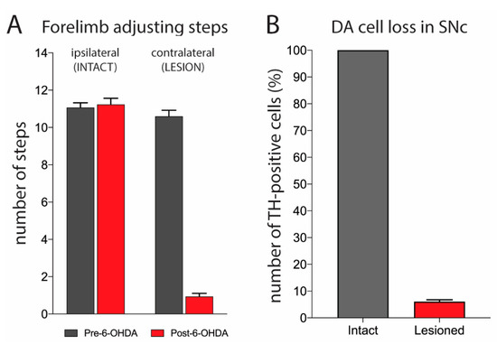 5.2. 6-OHDA-Induced Dopaminergic Lesions and Stepping Test