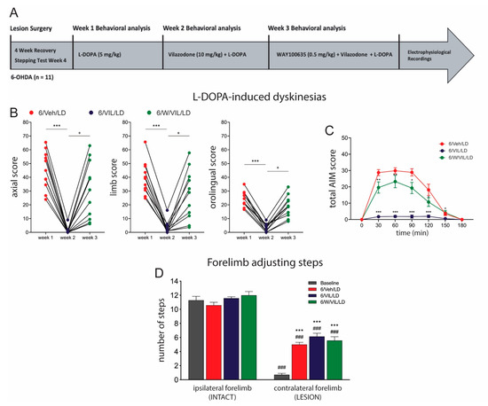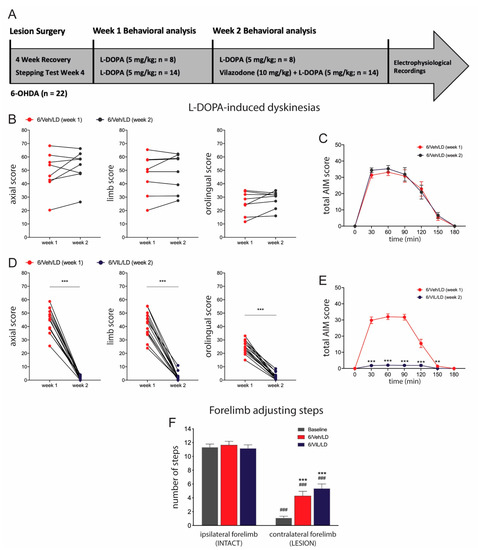 2.2. Vilazodone Suppresses Established AIMs, but Does Not Affect Improved Stepping Performance, after L-DOPA Treatment