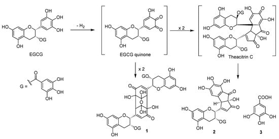 - Wei, Y.; Chen, P.; Ling, T.; Wang, Y.; Dong, R.; Zhang, C.; Zhang, L.; Han, M.; Wang, D.; Wan, X.; et al. Certain (−)-epigallocatechin-3-gallate (EGCG) auto-oxidation products (EAOPs) retain the cytotoxic activities of EGCG. Food Chem. 2016, 204, 218–226. [Google Scholar] [CrossRef] [PubMed]