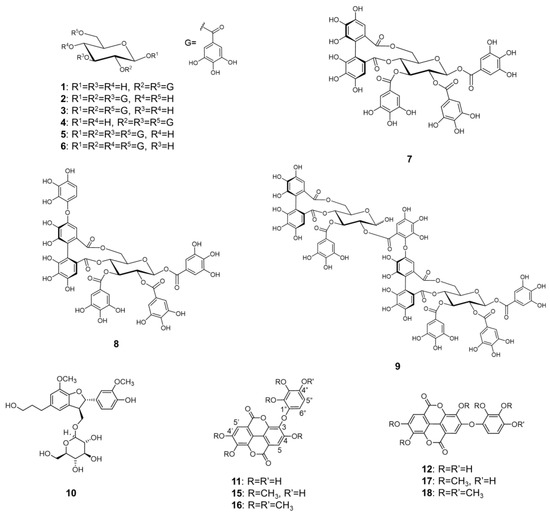 - Ito, H.; Yamaguchi, K.; Kim, T.H.; Khennouf, S.; Gharzouli, K.; Yoshida, T. Dimeric and trimeric hydrolyzable tannins from Quercus coccifera and Quercus suber. J. Nat. Prod. 2002, 65, 339–345. [Google Scholar] [CrossRef] [PubMed]