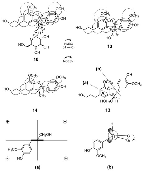 The key HMBC and NOESY correlations for compound 10, compound 13 and 14 chemical structures, and projection for 1La (a) projection in the direction of the arrow, the wedge indicates the plane of the A-ring); and 1Lb (b) transition for 13.