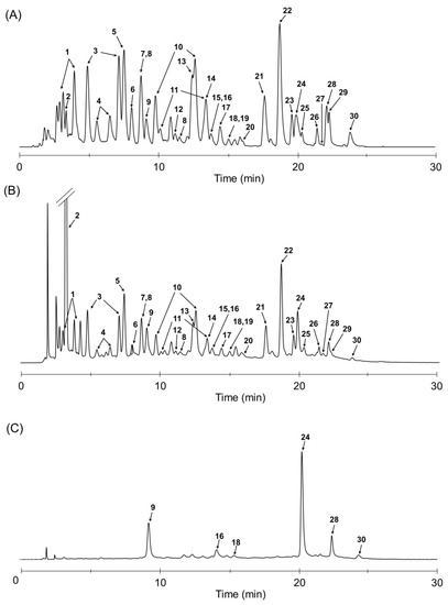 LC/UV/ESIMS analysis of TBE. Total ion chromatogram (A) and UV chromatogram at 280 nm (B) and 360 nm (C).